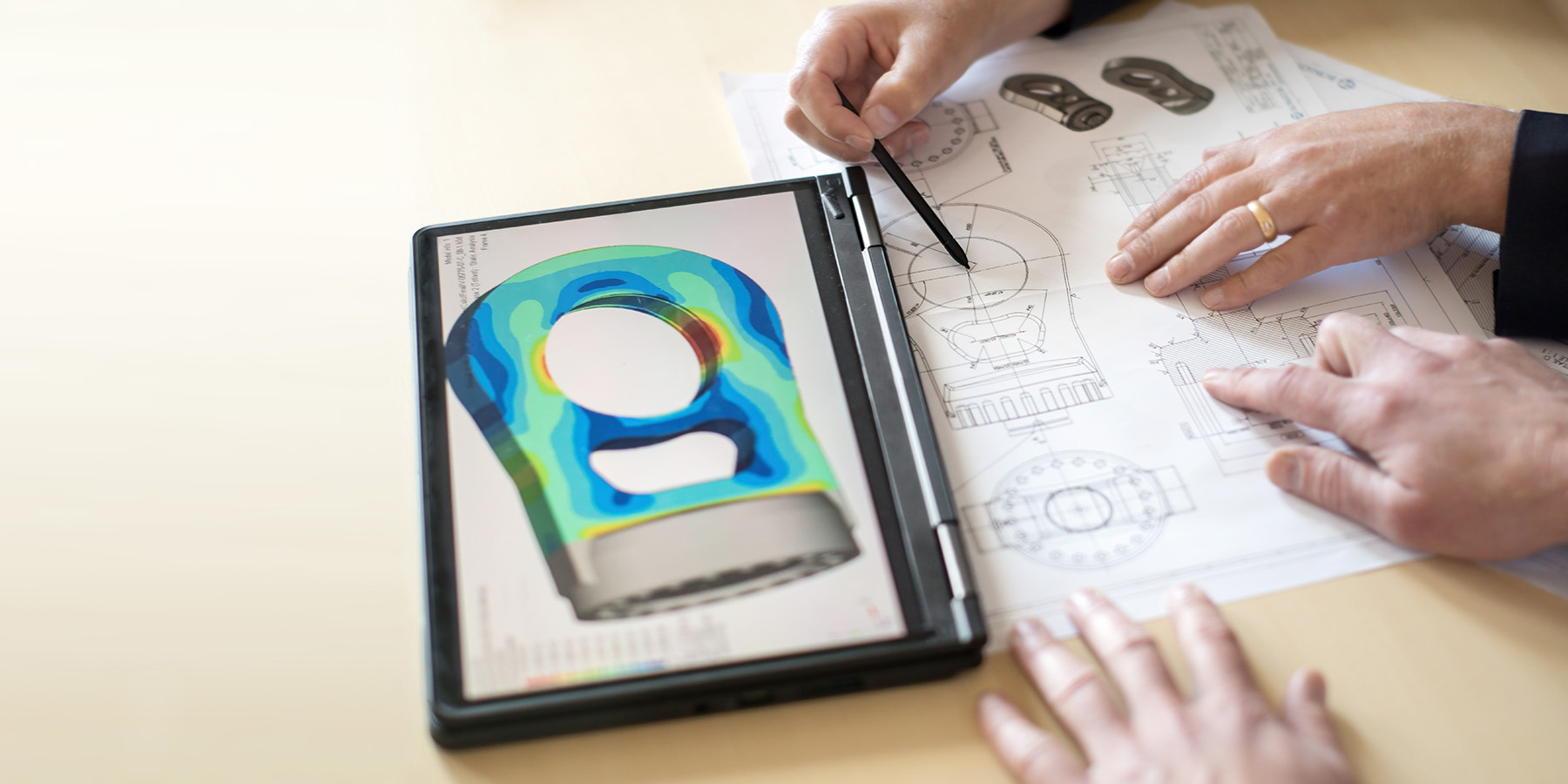 Durch die Berechnung und Simulation von Bauteilen oder ganzen Baugruppen gewinnen unsere Ingenieure frühzeitig einen Überblick über technische Eigenschaften der Entwicklung. Dies ermöglicht vor dem Bau von Prototypen eine Optimierung von Bauteilparametern. Verschiedene Szenarien können somit virtuell abgebildet und virtuell getestet werden.